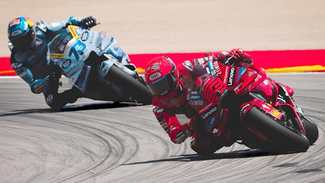 Rider Ducati Lenovo, Marc Marquez (kanan) dan BK8 Gresini Racing, Alex Marquez saat adu tikungan di sirkuit MotorLand Aragon.-Foto: ig @marcmarquez93-