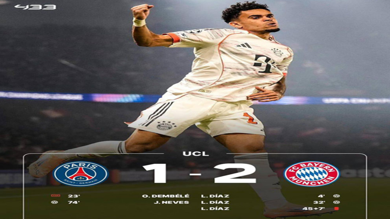 Dua gol Bayern dicetak oleh Luis Diaz di babak pertama, sementara PSG hanya mampu membalas sekali lewat Joao Neves.
