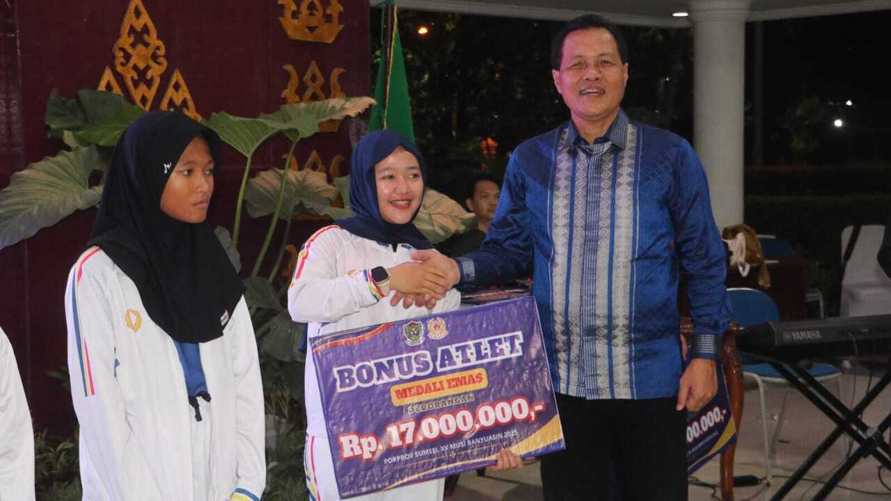 BONUS : Bupati Muara Enim H Edison memberikan bonus kepada atlet prestasi dan pelatih di ajang di ajang Porprov XV di Musi Banyuasin.-foto:dokumen palpos-