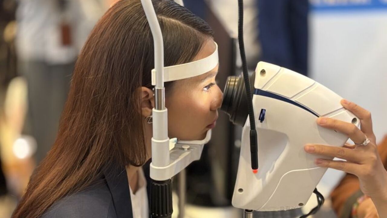 Aktris Yuki Kato mencoba fasilitas pemeriksaan mata kering di salah satu stan obat mata yang tersedia di Gandaria City usai mengikuti sebuah konferensi pers di Jakarta, Jumat (7/11/2025)-Foto : ANTARA-