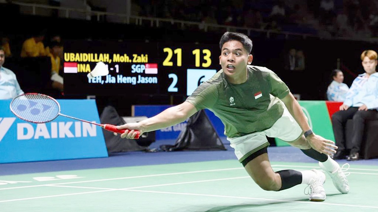 THAILAND - Pebulu tangkis tunggal putra Indonesia, Mohammad Zaki Ubaidillah, tampil gemilang pada debutnya di nomor beregu SEA Games 2025 di Thailand.