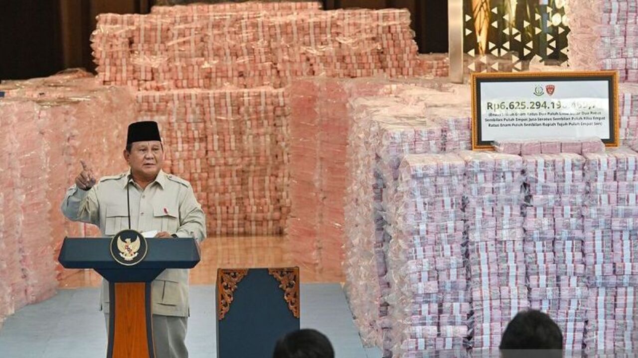 Presiden Prabowo Subianto menyampaikan pidato dalam seremoni penyerahan uang hasil penagihan denda administratif kehutanan dan penyelamatan keuangan negara dari hasil tindak pidana korupsi senilai Rp6,62 triliun di kompleks Kejaksaan Agung, Jakarta, Rabu -Foto: Antara-